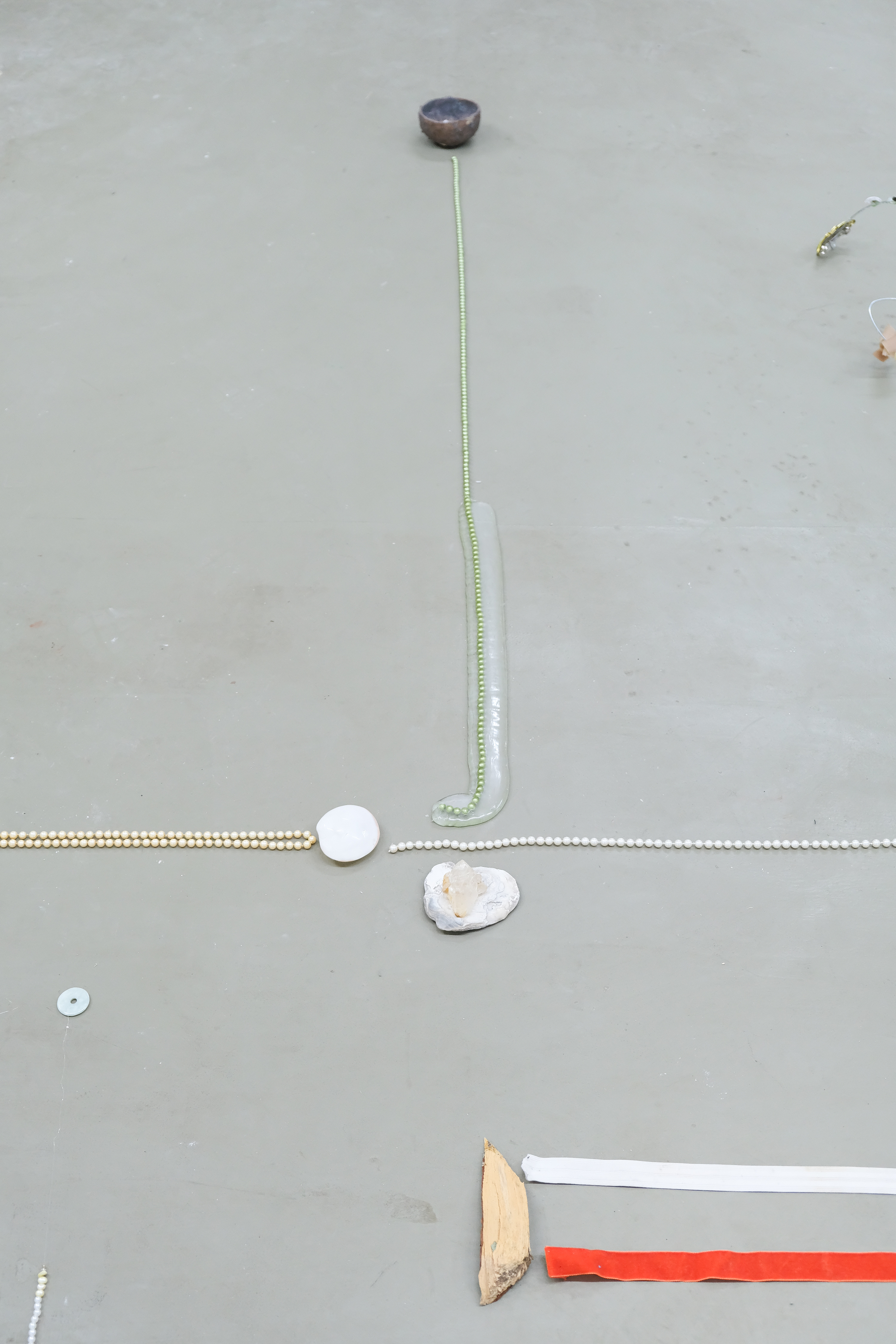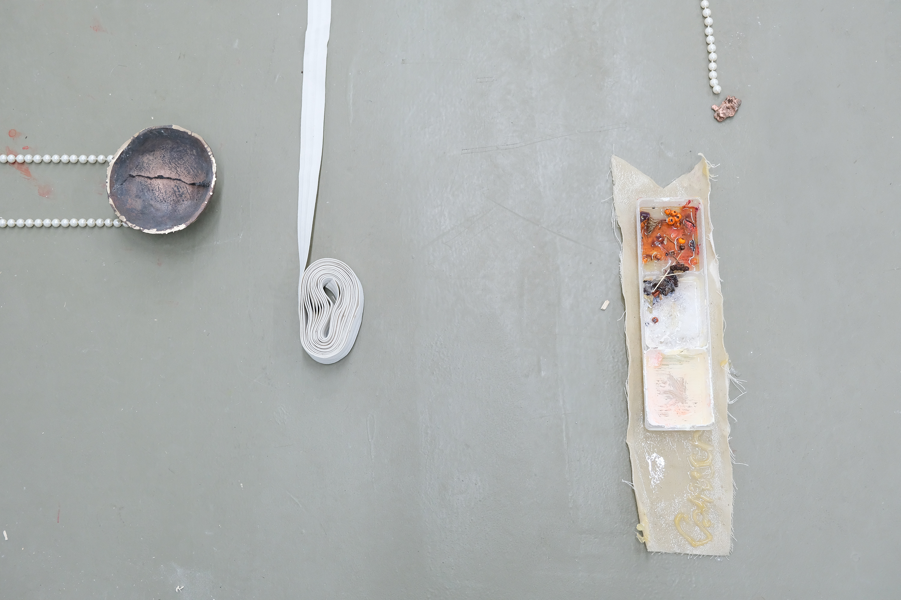 bronze casting, minerals, glass beads, sand, pigment, found objects